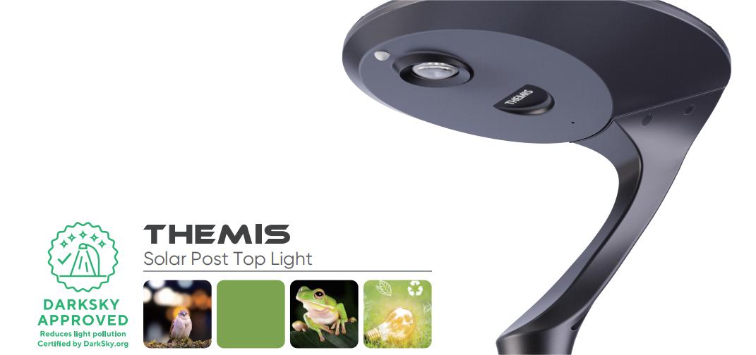 隆重推出 THEMIS 太阳能柱顶灯,其采用全新的未来主义设计。它的开发是为了保护本土动物免受蓝光的有害影响,并更大限度地减少 LED 灯的不必要的眩光。该灯的配光UWLR小于1%,提供均匀的照明性能,不会造成光污染。